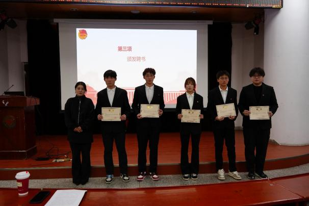 会上,席璇方、屈子睿为新聘任的学生干部颁发聘书。上一届学生会主席团成员苏芳郁作工作汇报,分享了学生干部经历中的经验与成长感悟。新任学生干部代表、学院学生会主席团成员葛莎莎作表态发言。