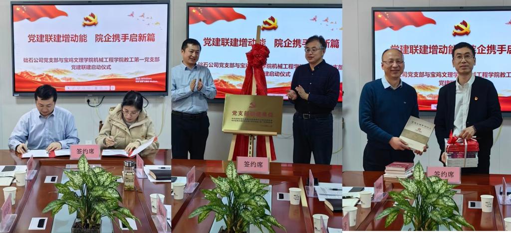 仪式开始前,两个党支部与会党员集中观看了《学习党的四中全会精神——向着宏伟目标接续奋进》视频学习资料。仪式上,武光泽和学院党委书记鲁海涛分别介绍了础石公司党支部和学院教工第一党支部基本情况,双方支部书记签署了党建联建合作协议,院长高晓龙和武光泽为党支部联建揭牌,宝鸡市础石金属检测有限责任公司副总经理杜铭和学院副院长王玮代表支部互赠了理论学习书籍。